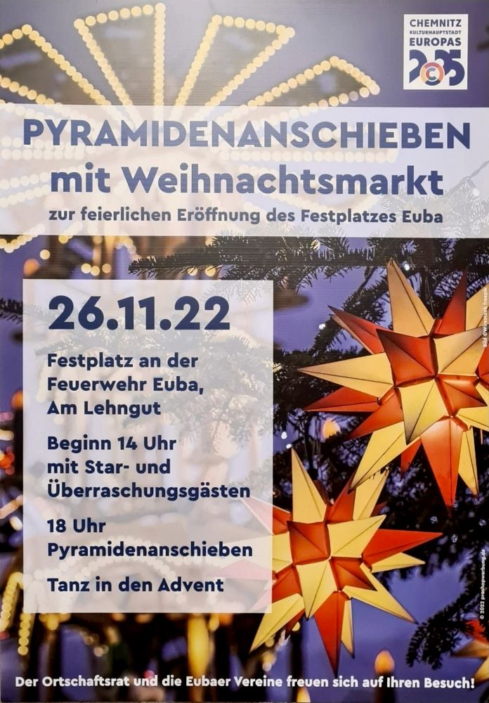 Außerdem gibt es wieder ein Adventssingen von unseren Kindern der Eubaer Grundschule und ein Konzert der Bläser des Kirchenchores. Weitere Überraschungen sind geplant.